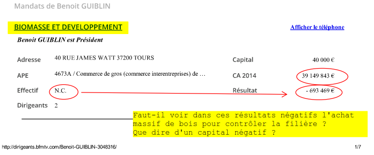 DALKIA ne travaille pas seul. Dans les locaux de DALKIA à Tours, on retrouve la société Biomasse et Développement (BED). Celle-ci a pour vocation d’approvisionner la société DALKIA en ressource biomasse, mais la BED est dirigée par Benoît GUIBLIN qui est également le directeur de la BED. La BED n’emploie aucun salarié (à vérifier). C’est en quelque sorte une société de domiciliation sous laquelle on va retrouver les activités d’autres entreprises. C’est là que le système devient plus opaque et c’est là que l’enquête doit déterminer les liens de la BED avec le cabinet Coudert, savoir où la BED s’approvisionne en biomasse et qui gère cette biomasse. Au niveau comptable, la BED génère un déficit de 693.469€ alors que son capital n’est que de 40.000€. La création d’un capital négatif est réglementée par la loi, à laquelle toutes les petites entreprises sont soumises.